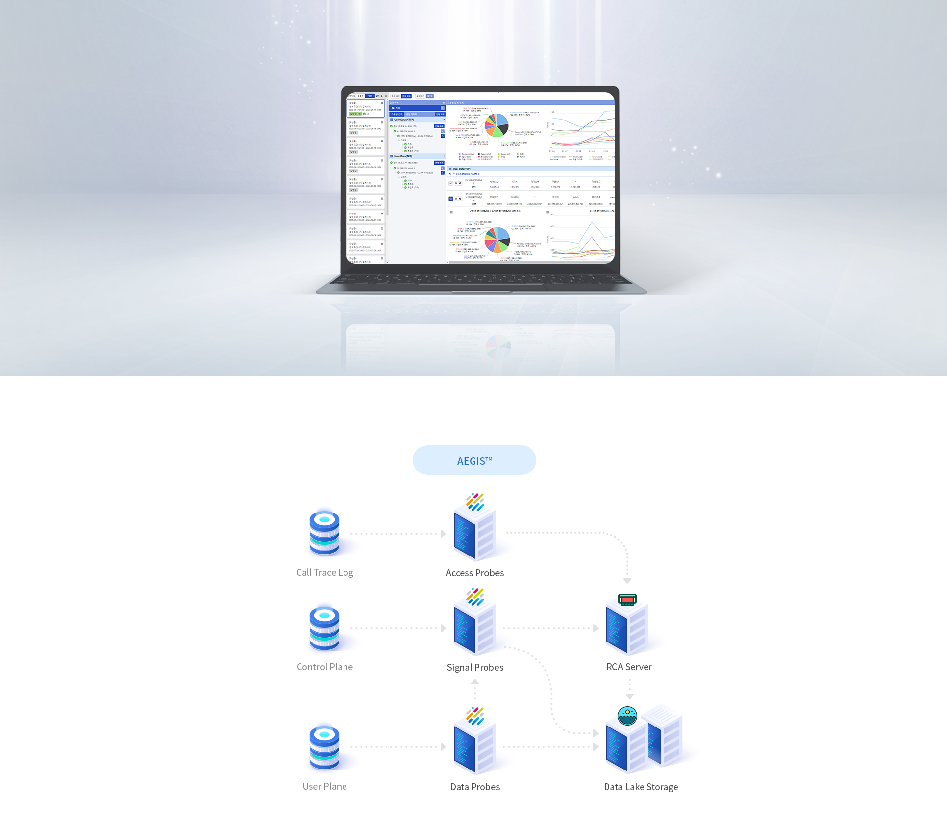 AEGIS is an End-to-End total solution that collects signal and data traffic from mobile network for 4G/5G(NSA/SA) in real-time to provide user call-based monitoring/analyze/statistics. By collecting real-time information from a various network interfaces (e.g. S1-MME, S11, S6a, S1U, etc.), AEGIS filters, correlates, assembles and structures the data to provide and inspect your network performance.